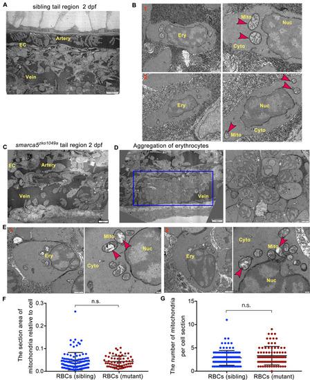 (A) The transmission electron microscopy (TEM) view of a longitudinal section through the artery and vein plexus in sibling tail region at 2 dpf. (B) TEM view of erythrocytes in sibling embryos. The red arrow heads indicate the characteristic pattern of organization in mitochondria. (C) TEM view of a longitudinal section through the artery and vein plexus in smarca5zko1049a tail region at 2 dpf. (D) The blue rectangular box showing blood clots in the caudal vein plexus in smarca5zko1049a. The magnification of blood clots is shown (right). (E) TEM view of erythrocytes in smarca5zko1049a. The red arrow heads indicate the characteristic pattern of organization in mitochondria. The disintegration of cristae in mitochondria is observed in smarca5-deficient RBCs. Ery, erythrocyte; EC, endothelial cell; Mito, mitochondria; Nuc, nucleus; Cyto, cytoplasm. (F) Scatter plots showing the section area of mitochondria relative to cell in RBCs from smarca5zko1049a and their siblings. (G) Scatter plots showing the number of mitochondria per cell section in RBCs from smarca5zko1049a and their siblings. Data are mean ± s.d. (F and G). Asterisk presents statistical significance (n.s. not significant). p Values were calculated by two-tailed unpaired Student’s t-test.