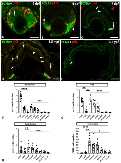 (A–E). Transverse sections of the retina of 2 dpf (A), 4 dpf (B), 7 dpf (C), 1.5 mpf (D), and 3–4 ypf (E) zebrafish specimens showing the presence of PCNA (arrowheads) or pH3 (arrows) positive cells. In 2 dpf to 1.5 mpf zebrafish (A–D), PCNA or pH3 expressing cells were mainly located in the CMZ but also in the central retina, while, in 3–4 ypf, specimens (E) pH3+ and PCNA+ cells almost disappeared. Dashed lines in (B–E) indicate the limit between the CMZ and the central retina. Scale bars: (A–C): 50 µm; (D): 100 µm; (E): 200 µm. (F). Graph showing significant changes in the number of pH3+ cells/section in the whole retina at different ages (Kruskal-Wallis test, p < 0.0001). (G). Graph showing significant changes in the number of pH3+ cells/section in the CMZ at different ages (Kruskal-Wallis test, p < 0.0001). (H). Graph showing significant changes in the number of pH3+ cells/section in the central retina at different ages (one-way ANOVA, p < 0.0001). (I). Graph showing significant changes in the number of PCNA+ cells/section in the central retina at different ages (Kruskal-Wallis test, p < 0.0001). Mean ± S.E.M. data and data on statistical multiple comparisons related to these graphs can be found on File S1. Asterisks indicate different levels of statistical significance: *, p < 0.05; **, p < 0.01; ***, p < 0.001; ****, p < 0.0001. |
