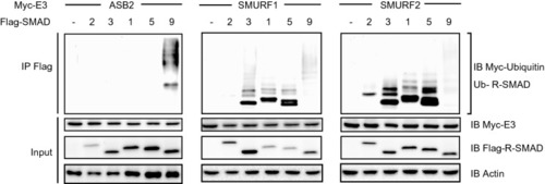 ASB2 specifically ubiquitylates SMAD9. HEK 293T cells were co-transfected with vectors coding HA-Ub, Myc-tagged E3 (Myc-ASB2, SMURF1 and SMURF2) and Flag-tagged R-SMADs (Flag-SMAD2, 3, 1, 5, 9) as indicated. Flag-immunoprecipitates or lysates were separated with SDS-PAGE and immunoblotted with the indicated antibodies. The cropped gel images were delineated and uncropped gel images are shown in the Supplementary Information. |