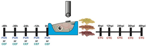 Experimental timeline of Shh modulation. Graphical representation of the dosing schedule of purmorphamine, ceftriaxone, and cyclopamine in relation to the timing of the TBI. |