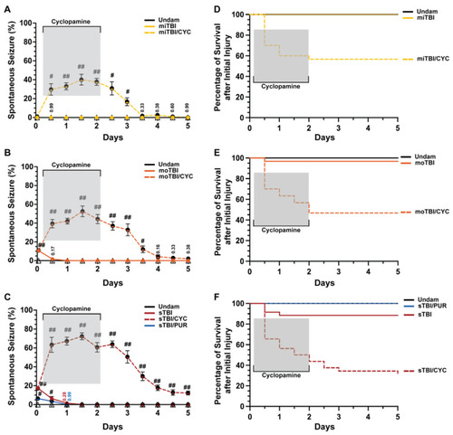 Modulation of Shh alters frequency of TBI-induced PTS events. (A–C) Percentage of fish that displayed spontaneous seizure events spanning the timeframe from within 1 hpi to 5 dpi with and without Shh modulation. (D–F) Percentage of survival across 5 days of fish who initially survived the primary injury across mi-, mo-, and sTBI with and without Shh modulation. Statistical analyses of the repeated-measures data were performed with the Friedman test, n = 100 fish per control/experimental group, grey box denotes period of cyclopamine administration, # p < 0.05, ## p < 0.01. |
