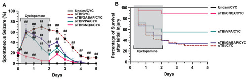 CNQX attenuates PTS in Shh-inhibited fish. (A) Percentage of undamaged and sTBI that were Shh inhibited (cyclopamine-treated) and cotreated with either valproic acid (VPA), gabapentin (GABAP), or CNQX that displayed spontaneous seizure events across 5 dpi. (B) Quantification of survival across 5 days of undamaged or sTBI Shh-inhibited fish cotreated with VPA, GABAP, or CNQX. Statistical analysis of the repeated-measures data was performed with the Friedman test, n = 100 fish per control/experimental group, grey box denotes period of cyclopamine/(VPA or GABAP or CNQX) administration, ## p < 0.01. |