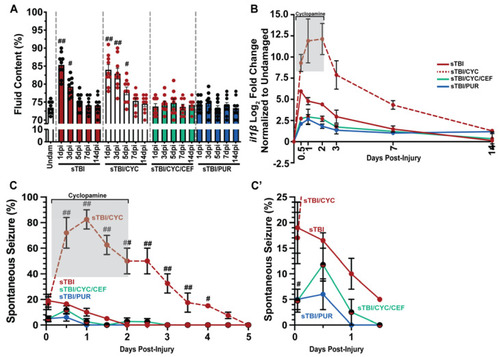 Prophylactic Shh activation attenuates TBI-induced edema, neuroinflammation, and PTS. (A) Histogram quantifying brain edema in undamaged and sTBI fish with and without Shh modulation and ceftriaxone treatment across 1 to 14 dpi (n = 9 fish per control/experimental group). (B) Expression of il1β by qRT-PCR in the cerebellum of sTBI fish with and without Shh modulation and ceftriaxone treatment compared undamaged fish (n = 3 per control/experimental group, with 5 pooled cerebellums/trial). (C) Percentage of fish that displayed spontaneous seizure events spanning the timeframe of from within 1 hpi to 5 dpi with and without Shh modulation and ceftriaxone treatment (n = 100 fish per control/experimental group). (C’) Expanded view of early post-traumatic seizure percentage. Grey box denotes period of cyclopamine administration. Statistical analyses were performed with either a one-way ANOVA followed by Tukey’s multiple comparison post hoc test (A), a two-way ANOVA followed by Dunnett’s multiple comparison post hoc test (B), or the Friedman test of the repeated-measures data (C), # p < 0.05, ## p < 0.01. |