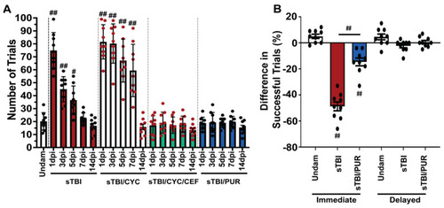 Cognitive impairments are attenuated by prophylactic Shh activation. (A) Histogram quantifying the number of trials required for associative learning assay of undamaged and either untreated or Shh-modulated sTBI fish at 1, 3, 5, 7 and 14 dpi (n = 9 fish per control/experimental group). (B) Quantification of immediate and delayed recall of undamaged, sTBI, and sTBI/PUR fish (n = 9 fish per control/experimental group). Statistical analyses were performed with a one-way ANOVA followed by Tukey’s multiple comparison post hoc test, # p < 0.05, ## p < 0.01. |