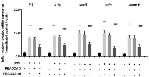 Effect of PEAOXA on mRNA expression of cytokine genes along the zebrafish intestine in presence (+) or absence (-) of DSS and PEAOXA 3 or 10 mg/L exposure. Expression values are normalised against the expression of β-actin mRNA, which was not significantly different between any of the treatment groups. Values represent the mean ± SE *** p < 0.001 compared with CTRL at the same time point and ### p < 0.001 relative to DSS 0.1% group. |