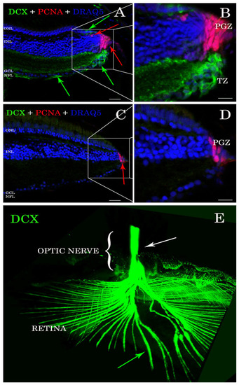 Sections of retina (A–D) and cleared tissue (E). DCX positive cells (green arrows) are detected in A. burtoni retina (A) but not in zebrafish (C). Magnification of (A,C) are presented in (B,D). The proliferating cell nuclear antigen (PCNA; red arrows) binding antibodies detect cells in the peripheral germinal zone (PGZ; of both species. In addition, DCX (green arrows) and PCNA (red arrows) are detected in the ONL corresponding to cones and rod precursors, respectively. Nuclei are stained with DRAQ5 (blue). No double positive cells for DCX (green arrows) and PCNA (red arrows) are found. By analyzing the whole transparent eyeball, it is possible to follow DCX positive processes in the neural fiber layer (green arrow) into the optic nerve (E; white arrow). Scale bar 20 µm (A,C); 10 µm (B,D). ONL: outer nuclear layer; INL: inner nuclear layer; GCL: ganglion cell layer; NFL: neural fiber layer. |