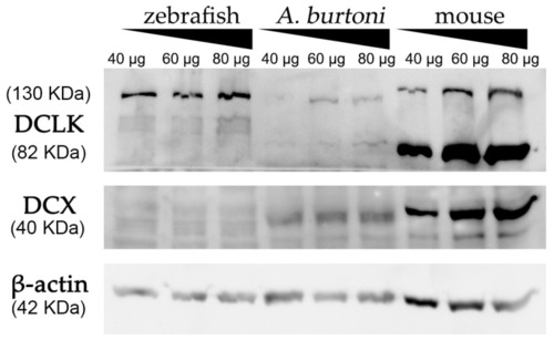Western blot analysis of protein extracts derived from zebrafish, A. burtoni, and mice brains. Increasing concentrations of proteins were loaded in each well (40, 60 and 80 μg per well). Analysis shows the expression of DCX in A. burtoni and mice, but not in zebrafish extracts. β-actin was used as the loading control after the membrane stripping. |