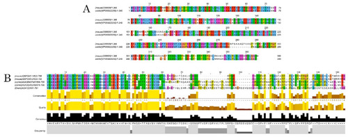 Alignments of DCX and DCLK amino acid sequences. Conserved residues between mice and A. burtoni DCX proteins (A); Conservation of the DCLK2 immunogen sequence use to detecting DCLK protein among the studied species (B). |