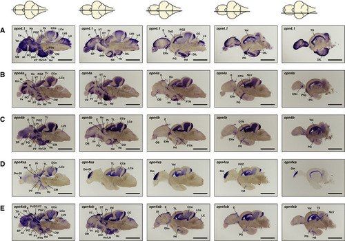 ishs on brain sections reveal broad expression of all five zebrafish (A–E) opn4.1 (A) opn4a (B) opn4b (C) opn4xa (D) and opn4xb (E). A horizontal line through a representation of the brain, above the section, indicates the location of the section within the brain. The names and abbreviations of all brain domains in which opn4 is expressed are listed in Table |