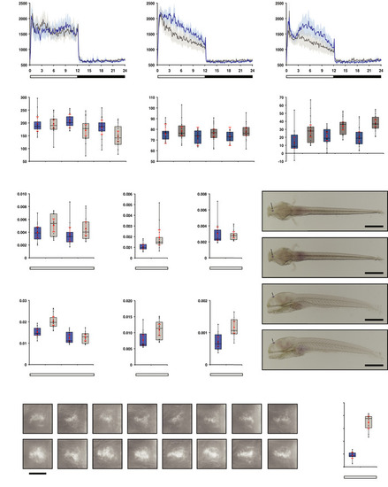 A-C Actograms show mean locomotor activity of wild‐type (blue line) and D Box plot shows reduced locomotor activity during the wake state in E Plot as in (D) for the rest state, shows no difference at 5 and 6 dpf and a significantly raised activity of the F opn4 dko larvae show significant more displacement in large‐angle turns at the onset of the dark interval than wild‐type on the 5th, 6th and 7th dpf (see also Fig EV3A–C G Plot shows asmt mRNA levels, detected by qPCR, in whole wild‐type (blue box) and whole opn4 dko (grey box) larvae at 6 dpf. H Plot shows a significant higher I Plot shows similar J ish with asmt probe on larvae sampled on the 6th dpf at ZT3 shows that asmt mRNA is confined to the pineal and indicates that the K Plot as in (G), shows significant higher levels of L Plot as in (H), shows significant higher levels of M Plot as in (I), shows significant higher levels of N ish with O Quantification of the adjusted intensity in the pineals from larvae presented in (N), implies a significant higher Data information: In (D–I), (K–M) and (O), boxplot divides the data in quartiles: the box indicates the interquartile range, with the horizontal line in the box denoting the median of the data set, the whiskers extend to the minimum and maximum, and meet the box at the median of the lower (quartile 1) and median of the upper (quartile 3) half of the dataset. Black dots indicate biological replicates (D–F: |