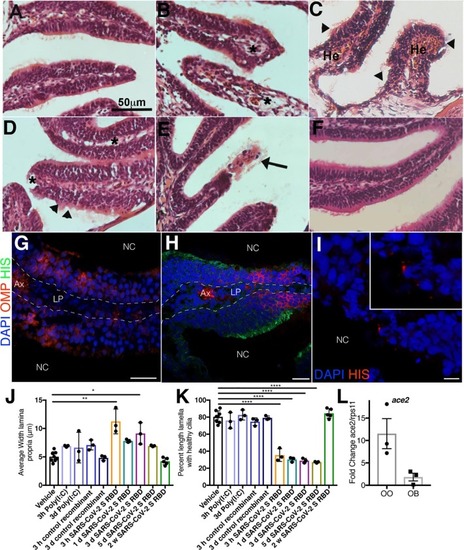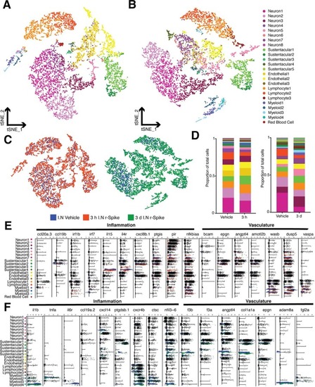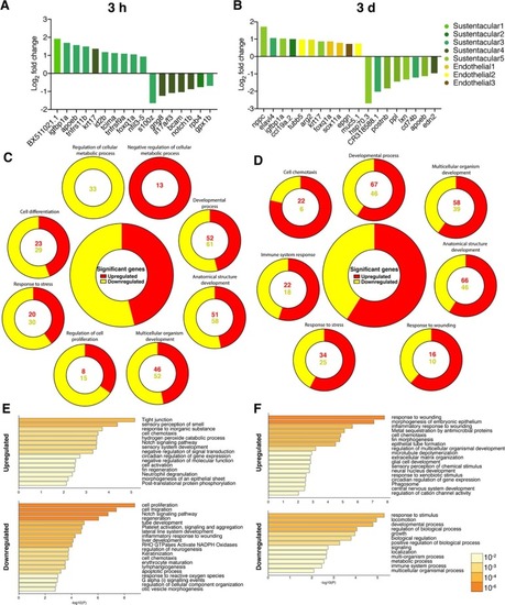 Fig. 6. Intranasal SARS-CoV-2 S RBD protein delivery causes transcriptional changes in zebrafish sustentacular and endothelial clusters. (A-B) Bar plots showing fold-change in expression of selected significantly differentially expressed genes in sustentacular and endothelial cell clusters in the zebrafish OO 3 h and 3 d post intranasal SARS-CoV-2 S RBD protein compared to vehicle controls identified by scRNA-Seq. (C-D) Summary webs of gene ontology analysis performed in ShinyGO v0.61 from the scRNA-Seq data showing the number of genes significantly up and down regulated in sustentacular and endothelial cell clusters in the OO of zebrafish 3 h and 3 days post-intranasal SARS-CoV-2 S RBD protein compared to vehicle treated controls. (E-F) Gene set enrichment analysis using Metascape of genes from sustentacular and endothelial clusters that were either significantly up or down regulated in zebrafish OO 3 h and 3 d post-intranasal SARS-CoV-2 S RBD protein compared to vehicle treated controls (adjusted P-value < 0.05). Significantly enriched terms are colored by P-value. |