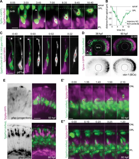 (A–A’) Schematic representation of zebrafish retinal development: (A) Neuronal birth and migration (48 hours post fertilization [hpf]). Neuroepithelial progenitors (gray) divide at the apical side and give birth to five major neuron types:photoreceptor (PR), HC, bipolar cell (BC), amacrine cell (AC), retinal ganglion cell (RGC). (A’) The layered organization of the mature zebrafish retina (92 hpf). Retinal neurons and a single type of retina glial cell, MGs, are arranged in three nuclear layers from apical to basal: outer nuclear layer (ONL), inner nuclear layer (INL), ganglion cell layer (GCL). These layers are separated by two plexiform layers: outer plexiform layer (OPL) and inner plexiform layer (IPL). The basement membrane (BM) separates the GCL from the vitreous body. (B) Scheme of bidirectional and bimodal migration of an HC progenitor and its committed precursors. Division of neuroepithelial progenitor (gray) generates HC progenitors (HCprs) (light green). HCprs display a bipolar morphology and are attached to the apical surface during the first phase of migration. Upon apical detachment, HCprs show multipolar morphology. En route to their destination, multipolar HCprs undergo a terminal mitosis to generate two HCs (green), which migrate toward the HC layer. Arrowhead: detachment of HCpr from the apical surface and onset of multipolar migration. Gray line: a representative HC migration trajectory (see also stills and trajectory in Figure 1—figure supplement 1A-B). (C) Time-lapse of HC tangential migration before BC lamination (50 hpf). Tg(vsx-1:GFP) labels BCs (magenta) and Tg(ptf1a:DsRed) marks HCs (green). White dot: tracked HC. Time in h:min. Scale bar: 10 μm. (D) Basal-to-apical migration trajectories of HCs before and after emergence of mature radially oriented BCs and MGs. HCs use both radial (apical-basal) and tangential (lateral) routes to move within the INL. See Figure 1—source data 1. (E) Maximum projections of retinae at different developmental stages: 38, 55, 65, 70, and 90 hpf. Tg(ptf1a:dsRed) labels HCs and ACs (green) and Tg(gfap:GFP) labels MGs (magenta). 38 hpf: birth and initiation of HC basal migration. GFAP+ cells are progenitors. 55 hpf: initiation of HC apical migration. 65 hpf: peak of HC apical migration. Higher magnification inset of the outlined region shows an HC at its final destination (arrow), and a migrating HC en route to the apical side (arrowhead). 70 hpf: emergence of the HC layer and MG maturation. arrows: show HCs within the HC layer. 90 hpf: mature and fully laminated retina. Scale bars: 50 μm, inset 65 hpf: 10 μm. See also Figure 1—figure supplement 1.