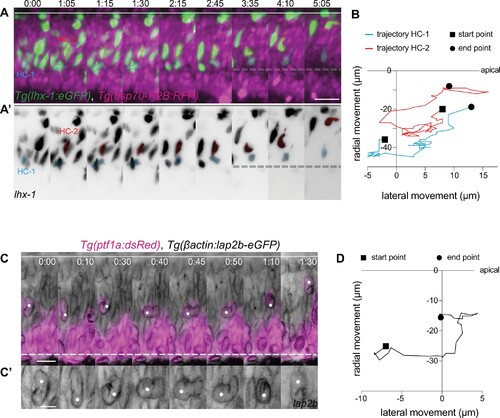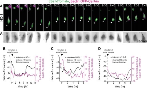 Analysis of HC centrosome position. (A–A’) Time series showing the dynamics of centrosome position in a migrating horizontal cell (HC) (HC-1). β-Actin:GFP-Centrin and trβ2:tdTomato DNA plasmids label centrosomes (magenta) and HCs (green), respectively. Arrowhead: tracked HC; white line: apical surface. (A’) Close-up of β-actin:GFP-Centrin (gray) in HC from (A). Scale bar: 5 μm. Time in h:min. (B–D) Graphs showing migration trajectory of three tracked HCs (black line), and the distance between their centrosomes and center (magenta line) throughout migration. See Figure 4—source data 3. Arrowhead: time of detachment from the apical surface. (B) Representing HC-1 from (A). |