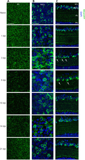 Mitochondrial distribution visualized on whole mounts and cryosections of MitoeGFP+ retinas, harvested at baseline (naive) or after ONC injury. (A) Morphological observations in the IPL of retinal whole mounts show that the number of GFP+ mitochondria was decreased from 3 dpi onwards, which results in minimal mitochondrial levels from 6–10 dpi. Baseline levels were reached again by 21 dpi. (B) In the RGCL, a rise in mitochondrial abundance and a more scattered pattern were detected at 3 dpi. Both the increase and the spread-out distribution of mitochondria were resolved over the following days, resulting in a similar distribution and number 3 weeks post-ONC. (C) Using retinal cryosections, less mitochondria were observed in the IPL between 3–6 dpi, compared to baseline. In this time window, mitochondria cluster in lines within the inner IPL close to the RGCL (white arrows). At 10 dpi mitochondrial numbers start to increase, first specifically in a region adjacent to the INL; they were restored throughout the complete plexiform layer at later time points. Two to three weeks post-injury, the mitochondrial distribution was roughly similar to that in the naive condition. In the RGCL, more mitochondria were observed at 3 dpi. No obvious changes in mitochondrial distribution were detected in the NFL. Scale bars: 25 µm, representative images of n = 4 per condition. DAPI: 4′,6-Diamidino-2-phenylindole; dpi: days post-injury; GFP: green fluorescent protein; INL: inner nuclear layer; IPL: inner plexiform layer; MitoeGFP: mitochondrial targeting sequence fused to enhanced GFP; NFL: nerve fiber layer; ONC: optic nerve crush; RGCL: retinal ganglion cell layer. |