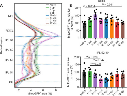 Inner retinal MitoeGFP+ area profile, combined with bar graphs representing the results per retinal layer, at baseline (naive) or after ONC injury. (A) Profiles of the MitoeGFP+ area covering all inner retinal layers at different time points after injury. (B) In the IPL sublaminae S2–S4, the mitochondrial area is decreased after injury, and baseline mitochondrial levels are re-reached from three weeks onwards. A transient rise in mitochondrial mass at 3 dpi was visible in the RGCL. Data represent mean ± 95% confidence intervals, n = 4–76 per condition, one-way analysis of variance followed by Tukey’s post hoc test. Dpi: Days post-injury; GFP: green fluorescent protein; INL: inner nuclear layer; IPL: inner plexiform layer; MitoeGFP: mitochondrial targeting sequence fused to enhanced GFP; NFL: nerve fiber layer; ONC: optic nerve crush; RGCL: retinal ganglion cell layer. |