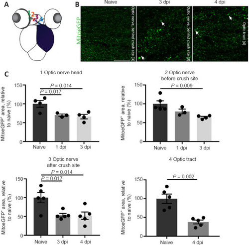 Mitochondrial distribution visualized and quantified on cryosections of MitoeGFP+ visual systems, harvested at baseline (naive) or after ONC injury. (A) Schematic overview of the four areas used to quantify mitochondrial density in the optic nerve/tract: 1) optic nerve head; 2) optic nerve before crush site; 3) optic nerve after crush site; 4) optic tract. (B) Compared to control fish, the number of mitochondria was reduced in all regions of the injured nerve, here visualized on representative parts of the optic nerve and tract at 3 and 4 dpi, respectively. Strikingly, mitochondria located after the crush site in the optic nerve/tract were often increased in size (white arrows). (C) Quantification of the MitoeGFP+ area confirmed a reduced mitochondrial density early after ONC, in the optic nerve head, optic nerve, and optic tract. Data represent the mean ± SEM, n = 3–5 fish per condition, one-way analysis of variance followed by Tukey’s post hoc test. Scale bar: 25 µm. Dpi: Days post-injury; GFP: green fluorescent protein; MitoeGFP: mitochondrial targeting sequence fused to enhanced GFP; ONC: optic nerve crush. |