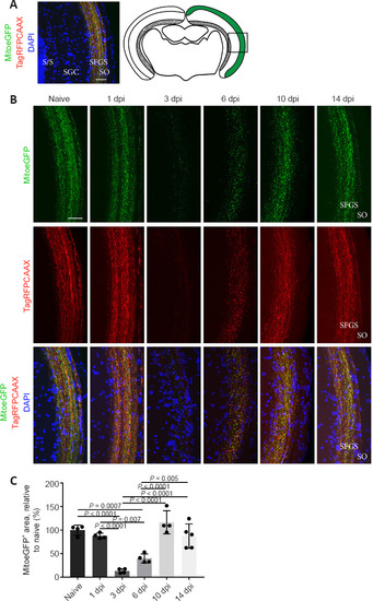 Mitochondrial distribution visualized on vibratome sections of MitoeGFP+ optic tecti, harvested at baseline (naive) or after ONC injury. (A) MitoeGFP+ mitochondria (green) can be observed in the RGC axon terminals (red), which were visualized using a membrane tag and located in the SO and SFGS of the zebrafish optic tectum. Nuclei were counterstained using DAPI (blue). The right panel depicts a schematic overview of a central coronal section of the optic tectum, with the magnified area indicated with a box. (B) Detailed images show that a bright overlap of labeled mitochondria (green) and axon terminals (red) was still visible in the optic tectum 1 day after ONC, both fluorescent signals were almost absent at 3 dpi. The axonal labeling as well as the GFP+ mitochondria reappeared to some extent at 6 dpi and baseline axonal/mitochondrial expression was restored from 10 dpi onwards. Note that the lower row panel shows the merged images, including counterstained nuclei using DAPI (blue). (C) Quantification of the MitoeGFP+ area in the SO and SFGS of the optic tectum confirmed that nearly all mitochondria were removed at 3 dpi, but that they gradually returned from 6 dpi onwards. Data represent the mean ± SEM, n = 4–5 fish per condition, one-way analysis of variance and Tukey’s post hoc test. Scale bars: 25 µm. DAPI: 4′,6-Diamidino-2-phenylindole; Dpi: days post-injury; GFP: green fluorescent protein; MitoeGFP: mitochondrial targeting sequence fused to enhanced GFP; ONC: optic nerve crush; RFP: red fluorescent protein; SGC: stratum griseum centrale; SFGS: stratum fibrosum et griseum superficiale; SO: stratum opticum; S/S: zone between album centrale and stratum periventriculare; TagRFP: membrane tag fused to RFP. |