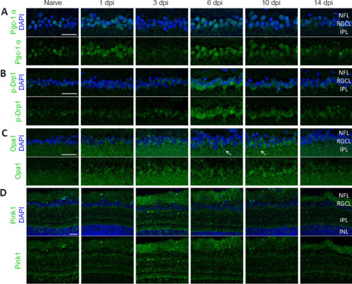 Immunofluorescent stainings for Pgc-1α, p-Drp1, Opa1, and Pink1 on cryosections of WT retinas, harvested at baseline (naive) or after ONC injury. (A) Representative images of retinal cryosections at various time points after ONC stained for Pgc-1α (green), reveal an increased expression of the biogenesis marker in RGC somas at 1 day post optic nerve damage, as well as from 6–10 dpi. (B) Fission was increased in RGC somas from 3–10 dpi, with the highest visible expression at 6 dpi, as shown using the p-Drp1 marker (green). (C) Stainings for Opa1 (green) at various time points after ONC do not show major differences in expression over time, although a marginal increase in Opa1 fluorescence was observed in the RGCL, which seems sporadically clustered in primary RGC dendrites close to the RGCL (arrows). (D) Lastly, mitophagy, visualized via immunostaining for Pink1, was increased at 3 and 6 dpi in both the NFL and IPL. In all panels, upper row images include the DAPI counterstaining (blue). Scale bars: 25 µm, representative images of n = 4 fish per condition. Dpi: Days post-injury; IPL: inner plexiform layer; NFL: nerve fiber layer; ONC: optic nerve crush; Opa1: optic atrophy 1 protein; p-Drp1: phosphorylated Drp1; Pgc-1α: proliferator-activated receptor gamma co-activator 1; Pink1: phosphatase and tensin homologue-induced putative kinase 1; RGCL: retinal ganglion cell layer. |