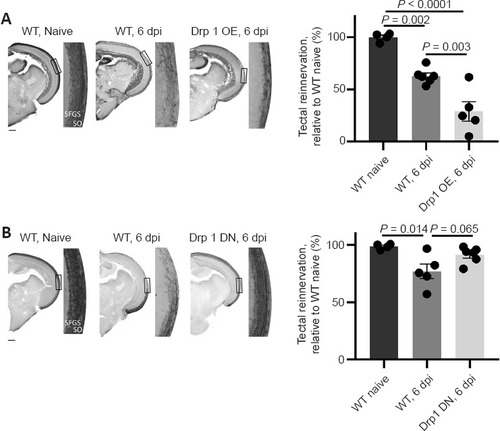 Quantification of tectal (re)innervation in WT, Drp1 OE, and Drp1 DN zebrafish at 6 days post-ONC (overview images and high magnification images from boxed areas). (A) Representative overview and detailed images (box), as well as semi-quantitative analysis of the tectal area covered by RGC axons reveal a significant reduction in optic tectum reinnervation at 6 days after ONC in the Drp1 OE condition, as compared to WT fish. (B) In Drp1 DN zebrafish, tectal reinnervation was enhanced, in comparison to WT animals. Scale bars: 200 µm. Data represent the mean ± SEM, n = 4–6 fish per condition, one-way analysis of variance followed by Tukey’s post hoc test. DN: Dominant negative; Dpi: days post-injury; Drp1: dynamin-related protein 1; OE: overexpression; ONC: optic nerve crush; WT: wild-type. |