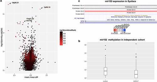Figure 1. mir152 is differentially methylated in NSCLP cohorts. (a) Volcano plot of differentially methylated regions (DMRs) in the 450 K cohort. Light blue spots are the best ranked DMRs by a p-value, methylation difference and quotient of difference by RnBeads. Arrows indicate DMRs at 8q24.21, 1p36.13, and mir152. (b) mir152 is significantly hypomethylated in the BSAS cohort. Boxplots with central lines as medians. p-Value = 0.005 (Mann–Whitney’s test). (c) mir152 expression changes are detected in developing craniofacial structures as revealed at the database Sysface. Higher signals for mir152 expression are detected in developing murine palate (E14.5) in red and also frontonasal prominences E10.5 and E11 (grey). |