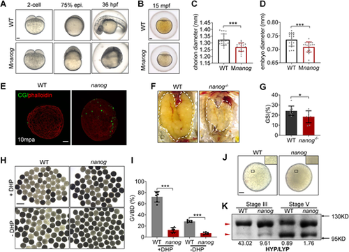 Loss of maternal nanog results in oocyte maturation defects. (A) Bright-field images showing the embryonic malformation of Mnanog mutants in contrast to time-matched WT embryos. Scale bar: 100 μm. (B) WT and Mnanog embryos with chorions at 15 mpf. Scale bar: 100 μm. (C,D) Measurement of chorion diameter and oocyte diameter at 15 mpf. ***P<0.001. n=20. (E) Representative images showing labeling of CGs in WT and nanog mutant eggs fixed at 10 mpa. F-actin was stained using phalloidin to show the outline of embryo. Scale bar: 100 μm. n=25. (F) Appearance of ovaries (outlined) dissected from WT and nanog−/− females. Scale bar: 1 mm. (G) The GSI of WT and nanog−/− females. n=8. *P<0.05. (H) Morphology of stage IV follicles dissected from WT and nanog−/− ovaries with or without incubation in DHP (1 μg/ml) for 2 h. Scale bar: 1 mm. (I) Comparison of the GVBD percentage in WT and nanog mutant follicles. Six fish of each group were analyzed. (J) Stage V follicles from WT and nanog mutant. Insets show enlarged regions of the yolk and relative opaqueness is seen in nanog mutants. Scale bar: 100 μm. (K) SDS-PAGE and Coomassie staining of major yolk proteins of stage III and stage V follicles. The higher and lower molecular weight yolk proteins (HYP and LYP) are indicated by the red arrowheads. HYP/LYP ratios were calculated (shown underneath) to represent yolk protein cleavage levels. |