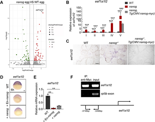 Nanog transcriptionally inhibits the expression of eef1a1l2. (A) RNA-seq analysis showing significantly increased expression of eef1a1l2 in nanog null eggs. Red dots indicate upregulated genes, green dots indicate downregulated genes, and gray dots indicate genes that were not differentially expressed in nanog mutant eggs. (B) Detection of eef1a1l2 expression in nanog mutant oocytes at different stages revealed by RT-qPCR. ***P<0.001. n=3. (C) Detection of eef1a1l2 expression in ovaries of WT, nanog mutant, and Tg(CMV:nanog-myc) in nanog mutant background by in situ hybridization on cryosections. Scale bar: 200 μm. (D,E) WISH (D) and RT-qPCR (E) analysis showed reduced expression of eef1a1l2 in nanog or En-nanog overexpressed embryos at 6 hpf. Images in D are representative of 36/36 embryos for WT, 38/39 for +EN-nanog and 32/32 for +nanog. **P<0.01. n=3. Scale bar: 100 μm. (F) ChIP analysis of Tg(CMV:nanog-myc) ovaries with anti-Myc antibody at 6 months post-fertilization. The promoter region of eef1a1l2 was enriched in precipitated chromatin. rpl5b served as a negative control. Schematic depicts the genomic sequence of eef1a1l2, and the sequence located between −3748 and −3496 bp upstream of the amplified region. |