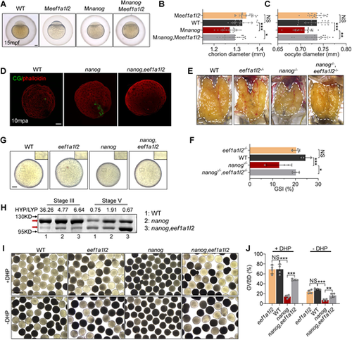 Depletion of eef1a1l2 rescues impaired oocyte maturation of the nanog mutant. (A) WT, Meef1a1l2, Mnanog and Mnanog,Meef1a1l2 embryos with chorions at 15 mpf. Scale bar: 100 μm. (B,C) Measurement of chorion diameters and oocyte diameters at 15 mpf. *P<0.05, ***P<0.001. NS, no significant difference. n=20. (D) Representative images showing labeling of CGs in WT, nanog and nanog,eef1a1l2 double-mutant eggs fixed at 10 mpa. F-actin was stained using phalloidin to show the outline of the embryo. n=15. Scale bar: 100 μm. (E) Appearance of ovaries (outlined) dissected from WT, eef1a1l2−/−, nanog−/− and nanog−/−,eef1a1l2−/− females. Scale bar: 1 mm. (F) GSI of WT, eef1a1l2−/−, nanog−/− and nanog−/−,eef1a1l2−/− females. n=3. *P<0.05, ***P<0.001. NS, no significant difference. (G) Morphology of stage V follicles from WT, eef1a1l2−/−, nanog−/− and nanog−/−,eef1a1l2−/−. Insets show enlarged regions of the yolk. Scale bar: 100 μm. (H) SDS-PAGE and Coomassie staining of major yolk proteins of stage III and stage V follicles. The higher and lower molecular weight yolk proteins (HYP and LYP) are indicated by red arrows. HYP/LYP ratios (shown above) were calculated to represent yolk protein cleavage levels. (I) Morphology of stage IV follicles dissected from WT, eef1a1l2−/−, nanog−/− and nanog−/−,eef1a1l2−/− ovaries with or without DHP (1 μg/ml) incubation for 2 h. Scale bar: 1 mm. (J) Comparison of the GVBD percentage in WT, eef1a1l2−/−, nanog−/− and nanog−/−,eef1a1l2−/− follicles. **P<0.01, ***P<0.001. NS, no significant difference. n=4. |