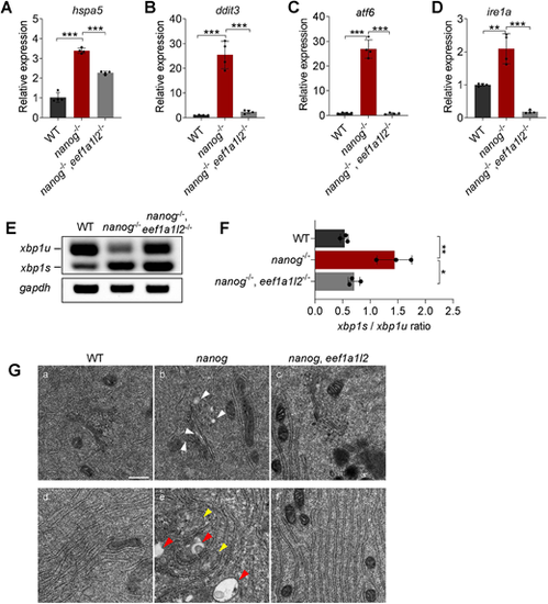 Depletion of eef1a1l2 ameliorates ER stress and UPR in nanog mutant oocytes. (A-D) RT-qPCR analysis showing decreased expression of hspa5 (A), ddit3 (B), atf6 (C) and ire1a (D) in nanog and eef1a1l2 double-mutant ovaries, compared with nanog mutant ovaries. **P<0.01, ***P<0.001. n=4. (E,F) RT-PCR examination of xbp1 splicing. The ratio of spliced xbp1 (xbp1s) mRNA to unspliced xbp1 (xbp1u) mRNA was increased in nanog mutant ovaries, but restored in nanog and eef1a1l2 double-mutant ovaries. gapdh was used as internal control. The xbp1s/xbp1u ratio in F represents the intensity ratio of the corresponding PCR product bands in E. *P<0.05, **P<0.01. n=3. (G) ER, Golgi and mitochondria structure in WT, nanog mutant and double-mutant stage I oocytes as revealed by transmission electron microscopy. White arrowheads indicate Golgi apparatus, yellow arrowheads indicate mitochondria, red arrowheads indicate lysosomes. Scale bar: 0.5 μm. |
