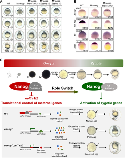 Maternal depletion of eef1a1l2 rescues the early embryonic defects of the nanog mutant. (A) Phenotype of WT, Mnanog, Mnanog,Meef1a1l2, Mnanog,MZeef1a1l2 and Mnanog,Zeef1a1l2 embryos at 0.2, 8, 12 and 24 hpf. Scale bar: 100 μm. (B) Detection of mxtx2, mir-430 precursor, blf and sod1 in WT, Mnanog and Mnanog,Meef1a1l2 embryos by WISH at the indicated stages. Scale bar: 100 μm. (C) Proposed model of Nanog function in oogenesis and early embryogenesis of zebrafish. Top: Nanog acts as a transcriptional repressor to suppress the expression of eef1a1l2 and maintain the correct translation level of maternal mRNAs during oocyte development. Then, Nanog switches to a transcriptional activator to prime ZGA in zygotes. Bottom: In WT oocytes, Nanog inhibits the transcription of eef1a1l2 and maintains the proper level of global translation, ensuring appropriate amounts of proteins are expressed. Good egg quality and normal embryonic development is thus guaranteed. In the absence of maternal nanog (nanog−/−), the balance of global translation is destroyed. Elevated translation results in excessive protein loading, leading to poor egg quality and failure of embryogenesis. In nanog and eef1a1l2 double-mutant oocytes (nanog−/−,eef1a1l2−/−), the global translation level is mitigated owing to the absence of eEF1A1l2, protein overloading is relieved and egg quality is also improved, thereby promoting a better embryonic morphology formation. Representative images shown in the schematic include data also shown in Figs 4G and 6A. |
