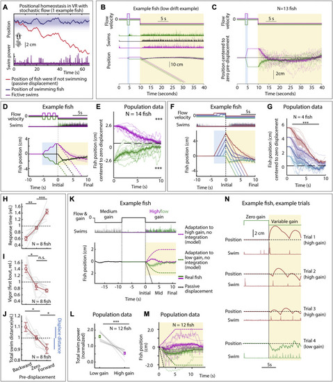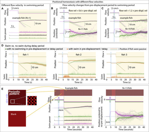 Additional features of positional homeostasis, related to Figure 1 (A) Trajectories of an example fish swimming against different flow velocities in the swim period. (B and C) Behavior when flow velocity in the swim period is lower or higher than that in the pre-displacement period. (D) Swimming in the pre-displacement or delay periods does not influence eventual fish location, i.e., fish track the visual stimulus and use integrated visual flow. (E) Stimuli used to test if visual flow is sufficient for positional homeostasis. The periodic pattern looks the same when translated by an integer number of finely spaced periods. During the pre-displacement period, the fish transitions an integer number of periods. In the delay period, the screen becomes blank to additionally test whether animals are locking on to a specific feature of their environment. In the swim period, the pattern becomes visible again. Single-fish and population data shows convergence, i.e., positional homeostasis can be based only on integrated visual flow. |