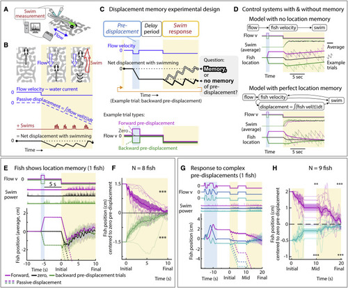 Larval zebrafish track their spatial location and correct for unintended displacements (A) Experimental setup: larval zebrafish fictively swimming in a virtual reality environment. (B) Fish swim in response to virtual flow so that their net displacement is smaller than the passive displacement. Dashed lines show passive displacements here and in later figures. (C) Experimental design: fish undergo one of various forced trajectories (blue pre-displacement period). After a delay period (white), they can correct for the pre-displacement by swimming the correct amount against a virtual flow in “closed loop” (yellow swim period). (D) Simulated fish behavior showing two classes of outcomes. If average trajectories during forward versus backward pre-displacements converge during the swim period, it implies fish have memory of self-location. (E) Example fish behavior in pre-displacement experiment. Average trajectories for the three trial types approximately converge at ∼5 s, showing that this fish has memory of pre-displacement. (Shaded regions, SEM in all panels.) (F) Trajectories (8 fish) normalized and centered to zero pre-displacement trajectory converge at ∼10 s, indicating accurate memory of previous location shift. (One-sample t test for final positions, ∗∗∗p < 0.001, p = 7.3e−8 for backward pre-displacement, specified mean = −1; p = 6.3e−7 for forward pre-displacement, specified mean = 1.) (G) Assay to test integration during stochastic pre-displacements and to examine corrections made over two swim periods separated by a delay. This example fish successfully corrects for stochastic pre-displacements; correction continues across two swim periods. (H) Population data showing accurate correction distributed over both swim periods, i.e., 1D path integration of complex trajectories. (One-sample t test, ∗∗p < 0.01, p = 0.0023 for forward pre-displacements at mid time point, ∗∗∗p < 0.001, p = 2.5e−5 for backward pre-displacements at mid time point. p = 2.1e−7 for forward pre-displacement at final time point, p = 5.8e−8 for backward pre-displacement at final time point. Data shown centered to average of trajectories that integrate to zero.). |