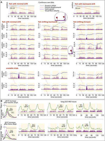 Examples of single, non-averaged trials, related to Figure 1 (A) Trajectories of three example fish (see Figure S4A for average trajectories of those and other fish). Trials are consecutive in groups of three, stacked vertically. For visualization, the start of the first of each triplet is shifted to zero. Little fictive “probe swims” are visible and magnified in the dashed circles; these probe swims are often present right after the start of a backward pre-displacement and at the start of swim periods and may inform the fish that it’s in an open-loop (pre-displacement) or closed loop (swim) period. We hypothesize that the probe swim in the pre-displacement may reduce subsequent swim attempts in the pre-displacement and delay periods, whereas in the swim period it may enhance further closed-loop swimming. In these fish, slow drift is present that can be minimal (left fish), backward (middle fish), or forward (right fish), i.e., positional homeostasis is not perfect. Figure S4A quantifies this drift and Figures S4B–S4F proposes an explanation in a control theory framework. The lower two rows illustrate “unstable trials,” showing that swimming behavior is variable and likely driven not only by visual flow but also other factors (e.g., fluctuating “internal states,” “noise,” etc.). (B) Single-trial SLO-MO activity traces during 6.5 min of data for two example neurons with different tuning properties in one fish. |