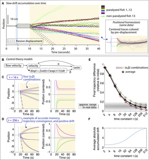 Drift in positional homeostasis and PID control theory, related to Figure 1 (A) Average trajectories showing drift in the swim period that can be slowly forward or slowly backward or minimal. Fish were not imaged. When fish were imaged and exposed to blue light-sheet laser light, drift tended to be larger. One unparalyzed fish was tested; this fish drifted forward. Despite the drift, average trajectories converged for every fish; average trajectories are shown in the same color for each fish for each of the three possible pre-displacements, with the different pre-displacements shown in distinct colors in the inset and in Figure S1C. (B) Diagram of PID control system (see STAR Methods). Swimming is modeled as a continuous variable, a weighted linear combination of a velocity term and a displacement term, and constrained to be non-negative. The displacement term is a leaky integral of fish velocity with memory time constant τ. (C) Example trajectories during simulated behavior with τ = 16 s for four (α,β) combinations, shown as raw position (left) and centered to the no-displacement trajectory (right). For this short time constant, trajectories converge only about halfway. (D) For a longer memory time constant τ = 256 s, trajectories converge much more. Importantly, trajectories can drift forward or backward despite the fact that positional memory is quite accurate. (E) For the four (α,β) combinations, the final trajectory difference is mainly a function of the memory time constant. In the real data, trajectories converge within about 5%–20%, suggesting a memory time constant of about a minute or more (gray shaded area). (F) The average accumulated absolute drift over (α,β) pairs. |