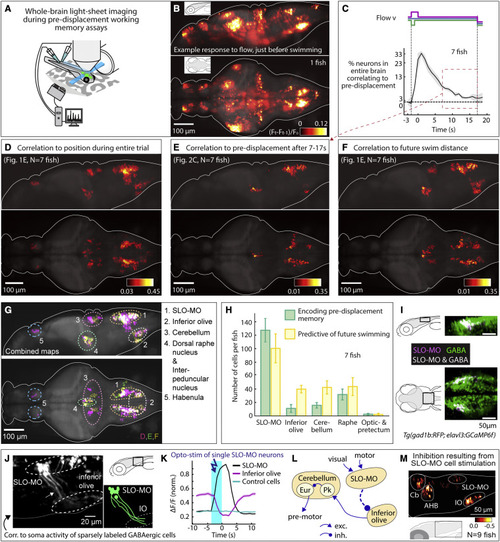 Figure 2. Whole-brain activity maps reveal neural populations encoding self-location (A) Virtual reality system for paralyzed zebrafish and light-sheet microscope for imaging whole-brain cellular activity. (B) Example brain-wide activity following forward visual motion, just before swim initiation in Tg(elavl3:GCaMP6f) fish (Figure S5A for earlier and later time points). Shown is the difference between imaging frames F t-1 and Ft normalized by baseline fluorescence, where F t+1 are frames containing the first swim bouts occurring after swim period onset. (C) Fraction of neurons across the brain with significant correlation to pre-displacement direction as a function of elapsed time. At 17 s after the pre-displacement, a fraction of neurons still encodes pre-displacement direction (shaded regions: SEM; arrow refers to time period used for analysis in (E); backward pre-displacement is shorter than forward to limit swimming during pre-displacement). (D) Whole-brain map of neurons encoding self-location during pre-displacement, delay, and swim periods. Cells with p < 0.005 for Spearman correlation in at least 80% of time points are shown (STAR Methods). Color bar represents averaged Spearman correlation coefficient to location. (E) Map of neurons encoding self-location during long delay period (C). Cells with p < 0.005 for Spearman correlation to self-location at every time point between 7 and 17 s are shown. Color bar represents averaged Spearman correlation coefficient of all time points. (F) Map of neurons whose activity at swim period onset (before first swim bout) predicts total distance swum in swim period. Cells with p < 0.005 for Spearman correlation at first two time points in the swim period are shown. Color bar represents averaged Spearman correlation coefficient. (G) Combined maps of (D)–(F) listing brain areas containing neurons potentially involved in self-localization. (H) Numbers of identified neurons (cell segments) per fish per area encoding memory of location during pre-displacement and delay periods, and numbers of neurons predicting future distance swum in the swim period. (Error bars, SEM.) (I) Dorsal hindbrain map of SLO-MO neurons and GABAergic neurons in Tg(elavl3:GCaMP6f; gad1b:RFP) showing strong overlap between SLO-MO and GABAergic populations (white). (J) Hybrid functional and anatomical tracing of SLO-MO neurites through sparse expression in Tg(gad1b:Gal4; UAS:GCaMP6f) using fluorescence correlation to SLO-MO cell body activity to help distinguish neurites in sparse gad1b line, showing innervation of IO (STAR Methods). (K) Optogenetic activation SLO-MO (single neurons of any functional type; STAR Methods) using CoChR59 in Tg(gad1b:Gal4; UAS:CoChR; elavl3:jRGECO1b) (see Figures S7K and S7L) shows IO neurons are inhibited during SLO-MO activation, indicating functional connection consistent with GABAergic inhibition. (L) Local circuit diagram of hypothesized SLO-MO inhibition of IO (dashed line) and known circuitry from IO to Cb cell types (Pk, Purkinje cells; Eur, eurydendroid cells, homologous to deep cerebellar nuclei). (M) Hindbrain functional map of decreases in cell activity (color bar, relative decrease ΔF/F) during SLO-MO activation (one neuron at a time) showing activity reduction in IO, cerebellum, anterior hindbrain (AHB), and non-stimulated SLO-MO cells. |