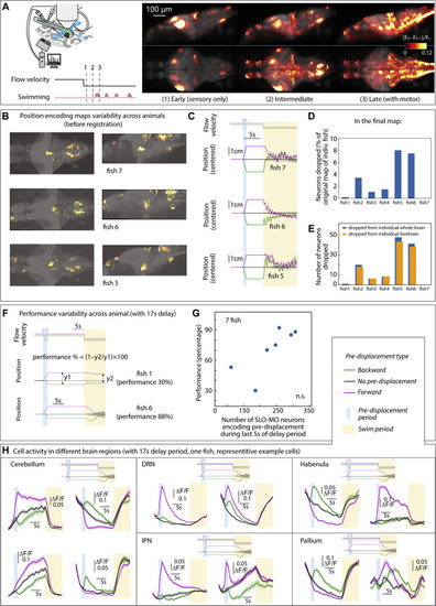 Positional homeostasis activity and variability, related to Figure 2 (A) Brain activity averaged over trials in an example fish shown as changes over time (ΔF/F)t-1 and (ΔF/F)t. Left: in the 300 ms following onset of backward flow through VR (forward visual motion from the point of view of the fish). Middle: at an intermediate time, after stimulus onset, just before (0–300 ms) swim onset. Right: immediately following (0–300 ms) swim onset. (B) Examples of functional brain maps for individual fish before combining them into the final map in Figure 2D. (C) With a 5 s delay period, fish perform positional homeostasis with little variability. (D and E) Percentage of neurons dropped from each animal was small, and that the majority of these neurons resided in the forebrain. (F and G) With a 17 s delay period, the number of SLO-MO neurons encoding the displacement memory appears to correlate to positional homeostasis performance, although the sample size is too small to be significant. (H) Persistent positional encoding signals were detected in different brain regions, cerebellum, dorsal raphe nucleus, area of the interpeduncular nucleus, habenula, and pallium. |