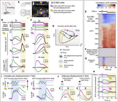 SLO-MO neuronal activity encodes self-location (A) Location of neurons with increasing activity following backward (yellow) versus forward (magenta) pre-displacement in example fish. (B) Examples (top) and average (bottom, with ΔF/F during no-displacement trials subtracted) of neurons with increasing activity following backward pre-displacement. (Shaded regions: SEM in all panels; here, 2 s forward or 1 s backward pre-displacements.) (C) Examples (top) and averages (bottom) of neurons with increasing activity following forward pre-displacement. (D) Principal-component analysis embedding of SLO-MO population activity. Trajectories remain separated throughout delay period, gradually converge and return toward the starting point during swim period. (E) SLO-MO neuron activity across 9 fish (1,347 cell segments) sorted by Spearman correlation, showing consistent correlation to self-location across trial types. (F and G) For comparison, lack of correlation to self-location for cells with activity correlating to swim vigor, and for cells in pretectum that show visual encoding. (H) Averages of ΔF/F (centered to zero pre-displacement, normalized in each fish) of positive- and negative-correlating neurons from (E). (I) Encoding of self-location by SLO-MO neurons during complex trajectories (example fish). (J) Encoding of sideways changes in self-location in SLO-MO neurons (example fish). |