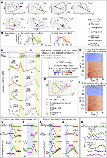 Further characterization of SLO-MO activity, dependence on complex trajectories and swimming, related to Figure 3 (A) Trajectories through dimensionally reduced network space for seven individual fish, related to Figure 3. Dimensionality reduction done with principal-component analysis (PCA). (B) Distance in PC space (first 3 components) between backward pre-displacement and zero pre-displacement, and forward pre-displacement and zero pre-displacement activity, for 9 fish. Since distances are zero or greater, noise causes distance to always be positive even before the pre-displacement at ∼2 s. (Shaded regions: SEM.) (C and D) SLO-MO cells showed a transient decrease in activity during swimming, after which they returned to activity levels encoding past displacements. (E and F) Ranked correlation of cell activity to fish position for example fish of Figures 3B and 3C separated by trials with and without swimming in pre-displacement and delay periods. (G) Neurons (in an example fish) with increasing activity following three consecutive backward or forward pre-displacements, showing integration. (Shaded regions: SEM in all panels.) (H) Neurons (in an example fish) showing integration over backward pre-displacements. The green trials are offset by one additional displacement 5 s before the triplet displacement; this is reflected in a persistent increase in neuronal activity. (I) Integration across triplet displacements by neurons that respond positively to forward displacements. (J) Additional example of integration by SLO-MO neurons during forward pre-displacements of varying durations followed by delay periods. (K) Individual neuron traces showing integration across triplet pre-displacements, fast imaging of single planes at 33 Hz. The firing rate of neuron 1 is low enough that individual spikes are visible in the calcium trace, showing persistently increasing spike rate after backward pre-displacements and persistently decreasing spike rate after forward pre-displacements. The firing rate of neuron 2 appears to be higher and, although individual spikes are not visible due to sampling rate and calcium indicator limitations, firing rate can be seen to increase following a backward pre-displacement relative to a forward pre-displacement. |