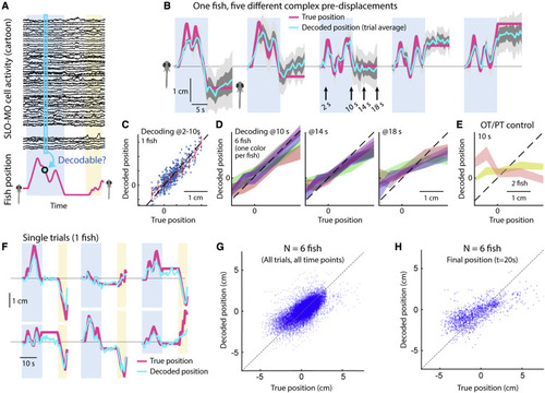 Decoding self-location from SLO-MO neuronal activity (A) Schematic of self-location decoding from SLO-MO population activity (cartoon data). (B) Decoding averages of complex location trajectories in pre-displacement and delay periods of stochastic displacement assay (dark gray: standard error [SEM], light gray: standard deviation [SD]). (Fish icons enlarged, not to scale.) (C) Decoding performance throughout pre-displacement period of example fish. (D) Decoding performance at start, middle, and end of delay period across N = 6 fish, showing gradually declining performance as SLO-MO memory decays over many seconds (colors: SEM for each fish). (E) Decoder trained on midbrain visual neurons performs poorly. (F) Example decoding of single trials, including first swim period. (G) Decoding self-location during entire trial across N = 7 fish, r = 0.54, p < 0.01. (H) Performance of decoding self-location at end of swim period (at t = 20 s), r = 0.68, p < 0.01. |
