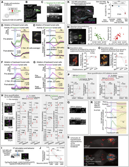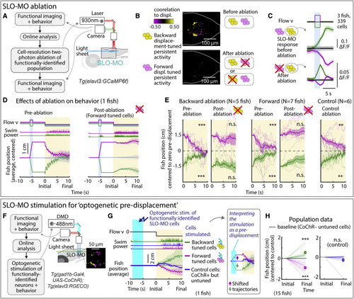 SLO-MO is necessary for location memory and changes future locomotion (A) Two-photon laser ablation of selected functionally identified SLO-MO neurons in Tg(elavl3:GCaMP6f) fish. (B) Ablating either population (example shown here: ablation of backward pre-displacement tuned cells) abolishes pre-displacement memory capacity of the entire population but leaves short-timescale sensory responses intact (C), suggesting integration through local connectivity within SLO-MO. (C) Following ablation of one functional population (here, forward displacement tuned neurons), SLO-MO responses of the remaining population (here, backward-tuned neurons) remain visually responsive but lose their persistence. (Shaded regions: SEM in all panels.) (D) Ablating neurons tuned positively to forward pre-displacement abolishes positional homeostasis in an example fish. (E) Population data showing consistent abolishment of positional homeostasis across N = 6 fish after ablation of either the forward or the backward pre-displacement encoding population, but not for nearby control neurons. (One-sample t test, ∗∗∗p < 0.001, p < 2.5e−5 for all pre-ablation, ∗∗p < 0.01, p = 3.8e−3 for backward pre-displacements after control ablation, p = 6.4e−2 for forward pre-displacements after control ablation, n.s. p > 0.05. Error bars: SEM in all panels.). (F) Stimulation setup for activating functionally identified SLO-MO populations using optogenetics in Tg(gad1b:Gal4; UAS:CoChR; elavl3:jRGECO1b) fish. (G) Optogenetic activation of backward pre-displacement encoding neurons (green) causes increased swimming 5–10 s later, and activation of forward pre-displacement encoding neurons (magenta) causes decreased swimming. Control cells that do not encode location do not affect swimming. Inset: manually shifted trajectories to illustrate the similarity to behavior with visual pre-displacements. (H) Population data showing consistent increases or decreases in swim distance following stimulation of neurons encoding backward or forward pre-displacements. (15 fish, one-sample t test, ∗∗∗p < 0.001, p = 4.9e−4 for stimulation of backward-tuned SLO-MO cells, p = 2.1e−6 for stimulation of forward-tuned SLO-MO cells, n.s. p > 0.05, p = 0.15 for stimulation of control cells.). |