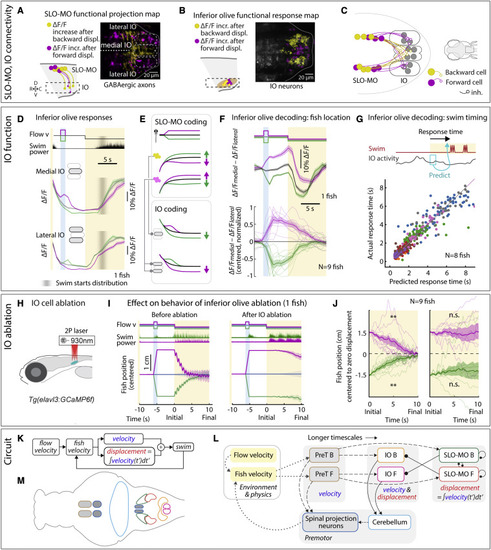 IO is functionally downstream of SLO-MO and necessary for positional homeostasis (A) Imaging projections from SLO-MO in IO area in Tg(gad1b:Gal4; UAS:GCaMP6f; elavl3:H2B-jRGECO1b). The gad1b channel shows anatomical segregation of projections of SLO-MO neurons that encode forward pre-displacements (projections to medial IO) versus backward pre-displacements (projections to lateral IO). Magenta (yellow) stands for forward-pre-displacement-positive (backward-pre-displacement-positive) SLO-MO cells. (B) Imaging IO neurons (same fish as in A; pan-neuronal channel shown) showing segregation of neurons responding positively to forward pre-displacements (medial IO) versus backward pre-displacements (lateral IO)—the reciprocal of (A), consistent with inhibition of IO by SLO-MO axons. Magenta (yellow) stands for forward displacements (backward displacements) of fish in VR. (C) Hypothesized connectivity between SLO-MO and IO based on (A) and (B). (D) Time courses of IO responses to location changes. Medial IO is persistently suppressed relative to no pre-displacement following backward pre-displacements. Lateral IO is persistently suppressed relative to no pre-displacement following forward pre-displacements. The initial high ΔF/F levels are carried over from the end of the previous swim period (example fish, population data shown in Figures S7N and S7O). (E) Schematic of location coding in IO versus SLO-MO and connectivity. (F) Fish location can be decoded from instantaneous IO activity by taking the difference between medial and lateral IO signals. (G) Predicting time of first swim bout during the swim period from IO activity at onset of the swim period (before first bout) across 8 fish. Swim time can be predicted, consistent with premotor role of IO. (H) Schematic of two-photon IO cell ablation. (I) Example fish positional homeostasis before IO ablation showing intact location memory, and same fish after IO ablation showing a complete loss of location memory. (J) Population data before and after IO ablation, showing consistent loss of ability to correct for positional shifts after ablation. Animals still swim in response to instantaneous flow, but memory expression is lost. Thus, IO is necessary for self-location memory and accurate positional homeostasis. (9 fish, Wilcoxon sign-rank test, ∗∗p < 0.01, p = 7.6e−3.) (K) Diagram of simplified control system for positional homeostasis, also used to simulate Figure 1D, bottom. (L) Diagram of hypothesized brain-wide functional circuit. Dotted gray lines: interactions between the brain and environment. Solid black lines: connectivity within the discovered multiregional hindbrain circuit that mediates location memory. Dashed black lines: direct or indirect connections between this circuit and candidate visual and premotor regions. Round head arrows, inhibitory connections; PT, pretectum; IO, inferior olive; SLO-MO, spatial location encoding medulla oblongata neurons. Colors correspond to the annotations in (M). (M) Approximate anatomical locations of circuit elements diagrammed in (L). |