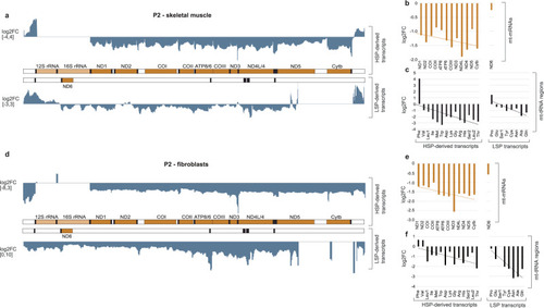 a Transcriptome-wide RNA-Seq analysis showing the effects of TEFM loss in skeletal muscle of patient 2 (P2) on mtRNA transcripts. A map of mtDNA showing the change in sequence read coverage (log2 fold change between patient 2 and two healthy controls) on both strands. b Quantification of the difference in reads per gene between skeletal muscle from P2 and from two healthy controls (n = 3 technical replicates) for mt-mRNA derived reads for both strands, from proximal to distal from the promoter and c reads corresponding to mt-tRNA for both strands in the order they are transcribed (n = 3 technical replicates) d Transcriptome-wide RNA-Seq analysis of the effects of TEFM loss in fibroblast cells of P2 on mtRNA transcripts. A map of mtDNA showing the change in sequence read coverage (log2 fold change between P2 and fibroblast cells from healthy controls) on both strands. e Quantification of the differences in number of reads per gene between fibroblasts from P2 and from two healthy controls (n = 3 technical replicates) for mt-mRNA reads and f reads corresponding to mt-tRNA fragments in the order they are transcribed from the promoter (n = 3 technical replicates). All trend lines were fitted by linear regression. Source data are provided as a Source Data file. |
