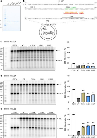 a SDS-PAGE analysis of the purified recombinant WT TEFM (amino acids 36–360) and the TEFM mutants used in the in vitro experiments. Molecular weight marker is indicated in the first lane. b DNA sequence (447–196) included in the mitochondrial Non-Coding Region (NCR), harbouring the transcription start site (+1) of the light strand promoter (LSP) and the Conserved Sequence Blocks (CSB) I, II and III. Highlighted are the CSB II sequence variants used in biochemical assays, G5AG7, G6AG7 and G8AG8. c–e CSB II sequence heterogeneity affects the capacity of TEFM mutants of preventing premature transcription termination at the CSB II region. Left panels: in vitro transcription from linearized templates that generate transcripts of ~400 nt (R.O.). Three templates with different (G)-tract sequence at CSB II were used: G5AG7 (c), G6AG7 (d) and G8AG8 (e). WT and TEFM mutants (250 fmol as a dimer) were assayed for their ability to abolish transcription termination at CSB II in each template. Right panels: The mean value of termination at different CSB II variants in the in vitro transcription. Error bars represent mean ± SD of three technical repeats, ns not significant, *p ≤ 0.05; **p ≤ 0.01; ***p ≤ 0.001 (two-tailed Student’s t test for comparison to reactions with WT TEFM). Source data are provided as a Source Data file. |