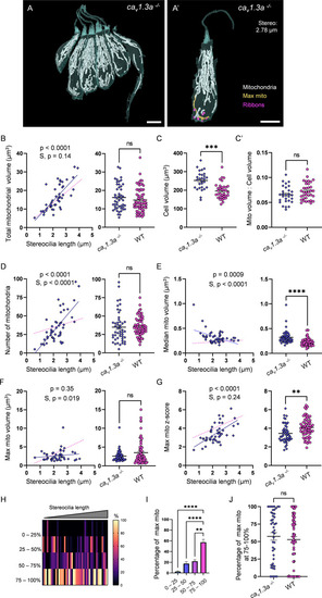(A) Two representative young hair cells (HCs) from a 6 days post fertilization (dpf) neuromasts (NM) (NM4, Figure 3—source data 2) with synaptic ribbons shown in purple. Scale bar = 4.5 µm. (A’) Two representative mature HCs from a 6 dpf NM (NM4, Figure 3—source data 2). Scale bar = 4 µm. (B) Relationship between HC stereocilia length and the total ribbon volume. (C) Relationship between HC stereocilia length and the average ribbon volume. (D) Relationship between HC stereocilia length and the number of ribbons. (E) Relationship between HC total mitochondrial volume and HC ribbon volume. Black line = standard linear regression, with significance as indicated. (F) Relationship between HC stereocilia length and the average minimum distance between each ribbon and the max mito. (G) Relationship between HC stereocilia length and the average minimum distance between each ribbon and the median mito. (H) Average minimum distance between each ribbon and the HC max or median mito. (In µm) Max mito: 1.9 ± 0.3; median mito: 6.3 ± 0.3. Mann–Whitney test, ****p<0.0001. HC: n = 65, 5 NMs, 3 fish, 5–6 dpf.