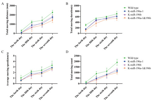 Analysis results of behavioral trajectory data of different groups of zebrafish. The green line indicates wild-type zebrafish; the blue line represents the miR-196a-1 gene knockout group (K-miR-196a-1); and the purple line represents the zebrafish of the miR-196b gene knockout group (K-miR-196b). Orange is the behavior of the miR-196a-1 and the miR-196b double mutant (K-miR-196a-1/196b). (A): The total movement distance of zebrafish (mm) was reduced in the gene knockout group, especially in the double knockout group; (B): the total movement time of zebrafish was decreased after knockout of miR-196a-1 and miR-196b; (C): the movement speed (mm/s) was decreased in the gene knockout group; (D): the movement times of the gene knockout zebrafish were decreased compared with those of the wild-type, but there were no obvious differences between the miR-196a-1 and miR-196b knockout groups. |