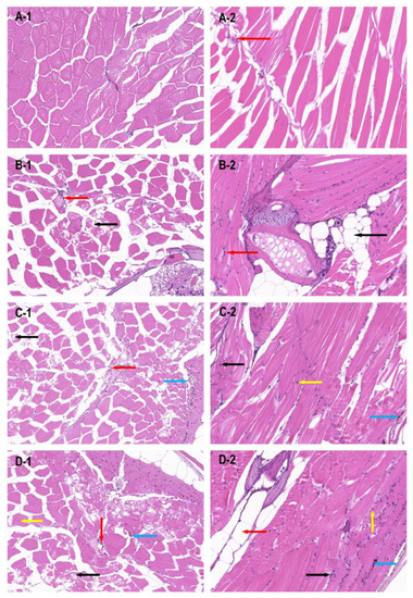 HE staining results of dorsal muscle tissue of zebrafish in different groups (20×).The dorsal muscle tissue was damaged when the miR-196a-1 and miR-196b genes were knocked out. (A) wild-type zebrafish; (B): zebrafish with miR-196a-1 gene knockout; (C): miR-196b gene knockout zebrafish; (D): zebrafish with miR-196a-1 and miR-196b gene knockout; -1 is the transverse section of muscle tissue, -2 is the longitudinal section of muscle tissue. The red arrow points to inflammatory cell infiltration, the black arrow points to vacuolar degeneration of muscle fibers, the blue arrow points to melanin deposition, the yellow arrow points to inward nuclear movement. PHENOTYPE: