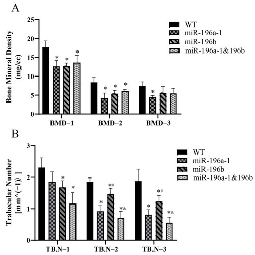 Results of bone mineral density and trabecular number in zebrafish knockout models. (A) The mineral density and (B) trabecular number were decreased in the miR-196a-1 or miR-196b knockout group. BMD-1 is the BMD or bone mineral density of the postcranial vertebra, BMD-2 is the middle spinal segment, and BMD-3 is the caudal vertebra. TB.N-1 is the trabecular number of the postcranial vertebra, TB.N-2 is the middle spinal segment, and TB.N-3 is the caudal vertebra. WT is wild-type zebrafish. K-miR-196a-1 is the miR-196a-1 gene knockout zebrafish; K-miR-196b is the miR-196b gene knockout zebrafish; K-miR-196a-1/196b is the zebrafish with miR-196a-1 and miR-196b gene knockout; compared with wild zebrafish, * p < 0.05; compared with miR-196a-1 gene knockout zebrafish, # p < 0.05; compared with miR-196b gene knockout group, & p < 0.05, n = 3. |