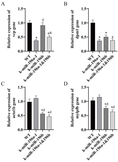The expression of muscle-related genes in miR-196a-1 or miR-196b knockout zebrafish was determined by real-time PCR. WT indicates wild-type zebrafish; K-miR-196a-1 indicates miR-196a-1 gene knockout zebrafish; K-miR-196b indicates miR-196b gene knockout zebrafish; K-miR-196a-1/196b indicates miR-196a-1 and miR-196b gene knockout zebrafish. (A) shows the relative expression level of the vcp gene, (B) is the dpm1 gene; (C) is the acta1b gene; (D) is the mylpfb gene. Compared with wild-type zebrafish, * p < 0.05; compared with miR-196a-1 gene knockout zebrafish, # p < 0.05; compared with miR-196b gene knockout zebrafish, & p < 0.05, n = 3. |