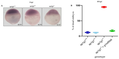 Characterization of ap1g1 mutant embryos. (A) Whole mount in situ hybridization (WISH) for dspb performed in embryos at 3.5 hpf. The experiment was done three times with n = 25 embryos at each experiment. Ratios at the bottom-right part of each picture specify the number of embryos showing the same staining pattern, compared to the total number of embryos used for each experiment. The images were taken in dorsal position at 32× magnification with a Zeiss Axiozoom V13 (Zeiss, Jena, Germany) microscope, equipped with a PlanNeoFluar Z1×/0.25 FWD 56 mm lens and Zen Pro software. (B) The graph in the panel shows, at 48 hpf, the percentage of dead embryos of the three different genotypes and the percentage of dead embryos after the microinjection with zebrafish wild type γ1 mRNA. The experiment was repeated three times. |