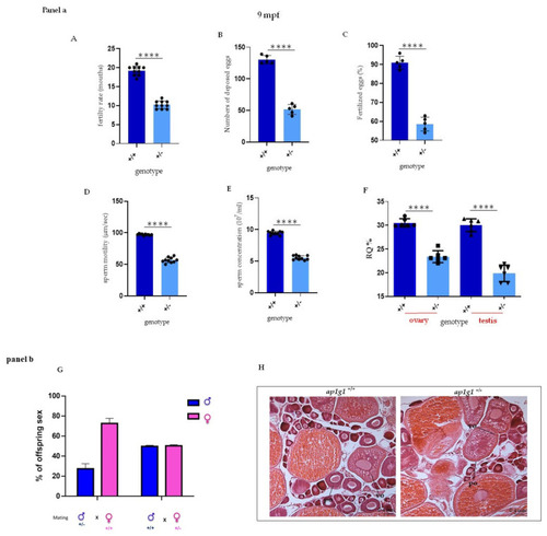 Fertility analysis in heterozygous ap1g1+/− fish. Panel a (A) The graph represents the fertility rate of heterozygous compared to +/+ females. The data are representative of five different experiments with 10 fish per group (B,C) The graphs show respectively the number of laid eggs and fertilized eggs in +/+ and +/− females at 9-mouths-old fish obtained by three different experiments; the observed female was 12 for each group. Concentration (D), velocity (E) and viability (F) of ejaculated sperm. Depicted is mean ± SEM. **** p < 0.0001; n = 10, in triplicate. Motility (D) and concentration (E) of ejaculated sperm from 1-year-old fish. Experiment was done twice. Motility: n = 10 +/+ mean = 97.20 and n = 10 +/− mean = 56.80; concentration: n = 7 +/+ mean = 9.46 × 107/mL and n = 7 +/− mean = 5.54 × 107/mL. (F) qPCR analysis on +/+ and +/− fish respectively in ovary and testis. The experiment was repeated twice. n = 10 for each column. Panel b (G) The graph represents the percentage of different offspring obtained by matings between ap1g1+/− male and ap1g1+/+ female and ap1g1+/+ male with ap1g1+/− female. (H) Histological analysis of ap1g1+/+ and ap1g1+/− ovary detects oocyte maturation defects in mutant females; black arrowheads indicate debris of atretic follicles. Abbreviations: po primary oocyte, vo vitellogenic oocyte. |