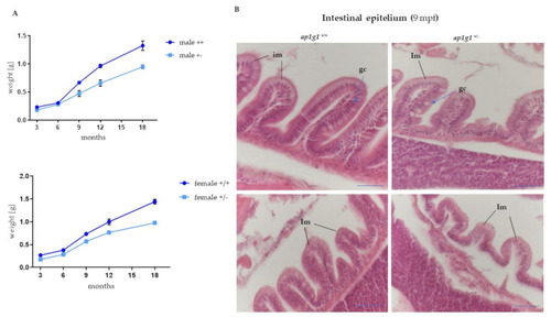Histological analysis of intestinal epithelium in adult fish. (A) Growth curve of ap1g1+/+ and ap1g1+/−. Body weight (in gr) was measured at different ages of adult life from 3 to 18 months. Both males’ and females’ ap1g1+/− body weight is significantly lower compared to ap1g1+/+. Statistical significance was determined by multiple t-test comparing each age group. For each group, 10 individuals were used and data was derived from two different experimental groups. (B) Histological analysis of ap1g1+/+ and ap1g1+/− intestinal mucosa with abnormal epithelium at the villous tips and reduced height of villi in the heterozygous mutant at 9 months age-old compared to wild-type homozygous fish. Scale bar = 100 μm Abbreviations: im: intestinal mucosa; gc: globet cells. PHENOTYPE: